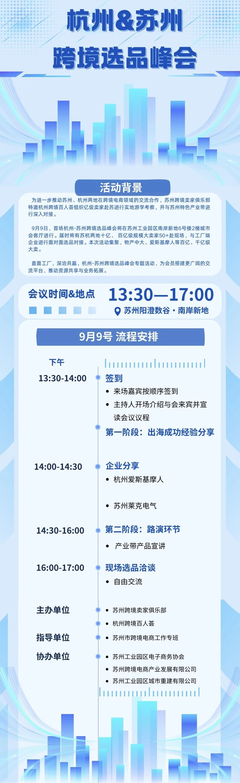 活動為賣家與企業(yè)搭建廣闊的交流平臺,邀請?zhí)K州、杭州兩地十億、百億級規(guī)模大賣家與工廠端企業(yè)進行面對面選品對接,推動資源共享與業(yè)務(wù)拓展,進一步推動蘇杭兩地在跨境電商領(lǐng)域的深度合作。