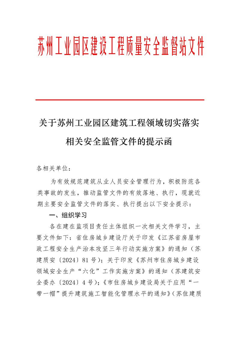 關(guān)于蘇州工業(yè)園區(qū)建筑工程領(lǐng)域切實(shí)落實(shí)相關(guān)安全監(jiān)管文件的提示函
