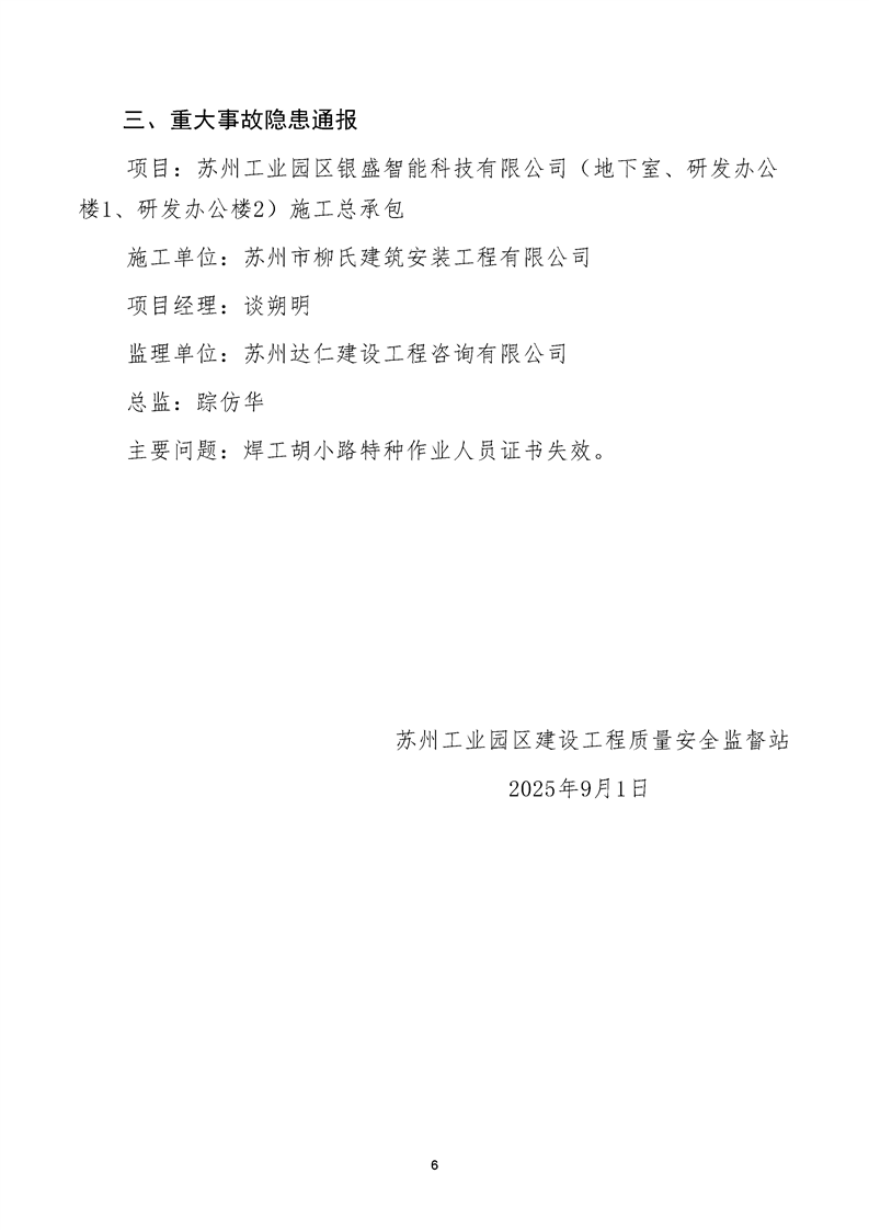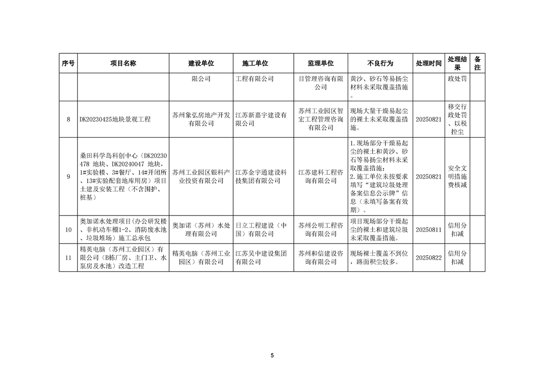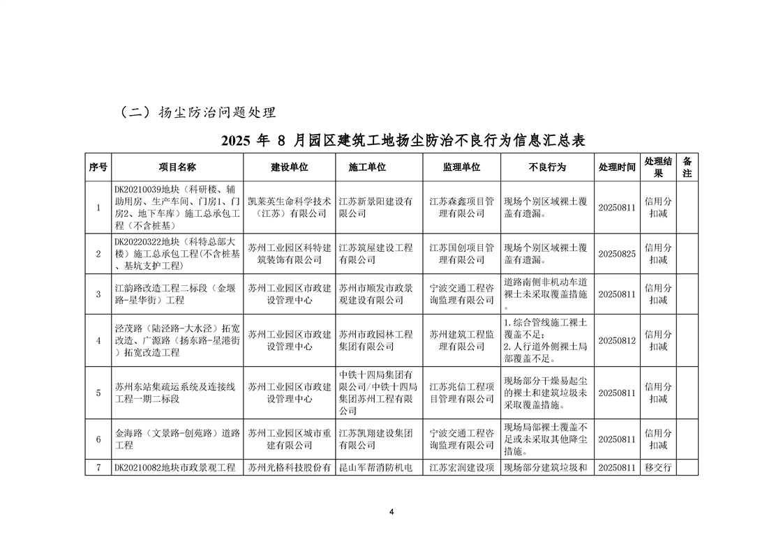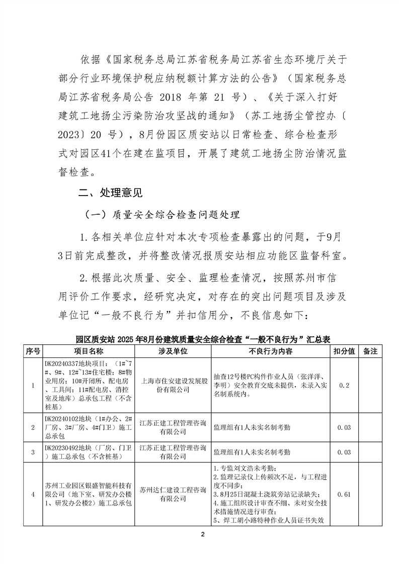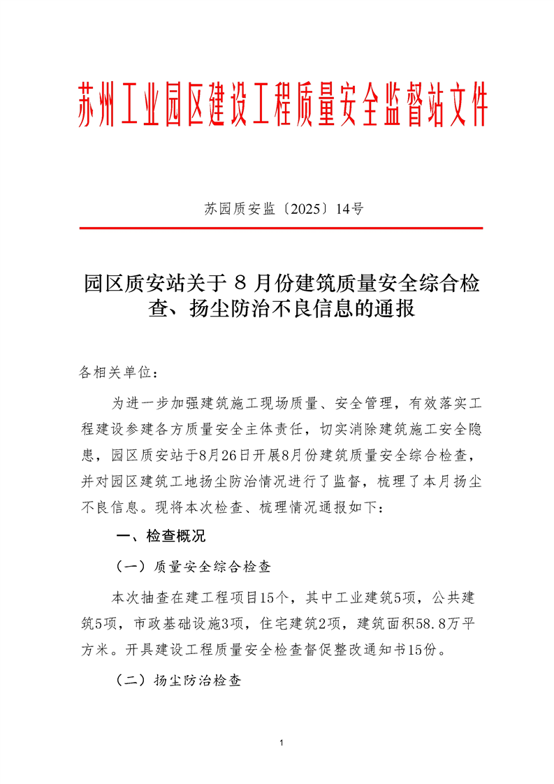 園區(qū)質(zhì)安站關(guān)于8月份建筑質(zhì)量安全綜合檢查、揚塵防治不良信息的通報