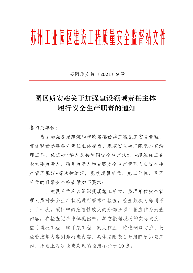 園區質安站關于加強建設領域責任主體履行安全生產職責的通知