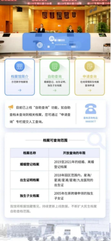 目前,可掌上查閱的民生檔案涵蓋2019至2021年在園區辦理的婚姻登記檔案,2018年園區星海醫院、星湖醫院、星浦醫院、星塘醫院和九龍醫院的出生醫學證明檔案,2005年在原跨塘鎮申領的獨生子女證。