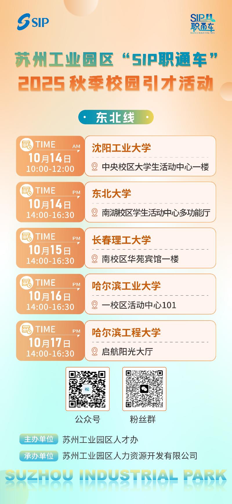 金秋十月,求賢若渴。為精準對接優質青年人才,賦能園區企業高質量發展,10月14日至18日,在園區人才辦指導下,新建元圓才攜手27家園區優質名企開啟蘇州工業園區“SIP職通車”校園引才專線首發線路-東北專線,深入東北人才腹地,開啟一場人才招引之旅。