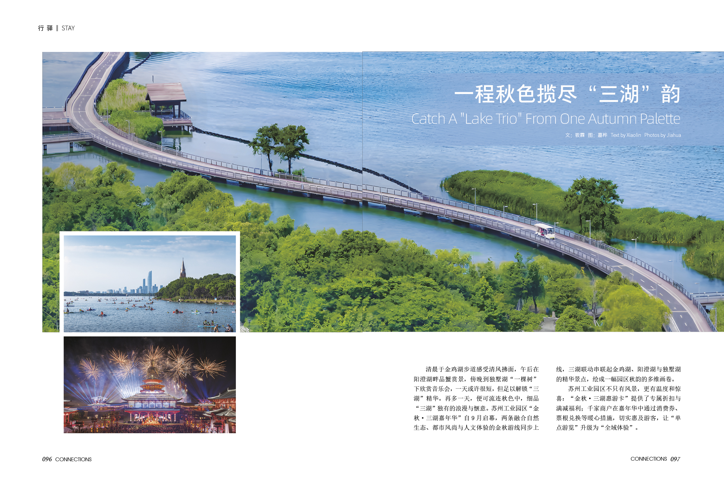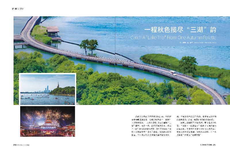 在本期《東方航空》雜志中,蘇州工業園區的三湖秋色一覽無余。文章通過“浪漫金雞湖的歸心旅途”、“蟹肥秋濃,滿澄盡啖黃金甲”、“蕩起雙槳,獨墅湖涌動青春活力”三個板塊,將園區的秋韻花卷娓娓道來。它向讀者呈現了金雞湖的都市繁華、陽澄湖的肥美湖鮮,以及獨墅湖的青春活力,讓東航國際國內旅客在高空閱讀中,感受到蘇州工業園區的開放、友好與活力。