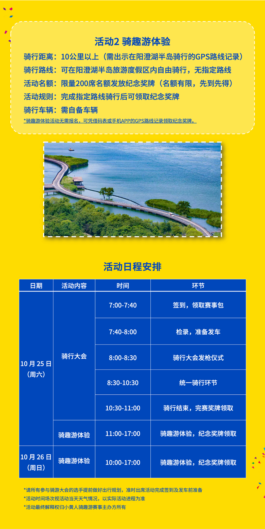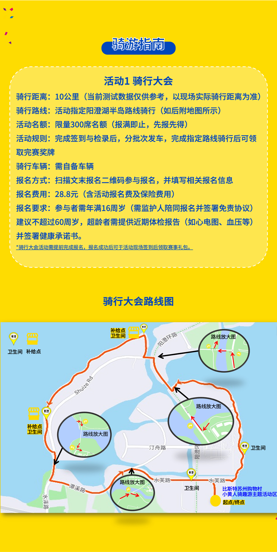 此次活動分為騎行大會、騎趣游體驗兩種形式,騎行大會需自備車輛、按照指定路線騎行,騎行距離約為10公里,參與者需年滿16周歲,完成指定路線騎行后可領取完賽獎牌,報名費用為28.8元;騎趣游體驗也需自備車輛,可在陽澄湖半島旅游度假區(qū)內(nèi)自由騎行,騎行距離為10公里以上(需出示在陽澄湖半島騎行的GPS路線記錄),完成騎行后可獲得紀念獎牌(限量200席名額),該項活動無需報名,可憑借碼表或手機APP的GPS路線記錄領取紀念獎牌。