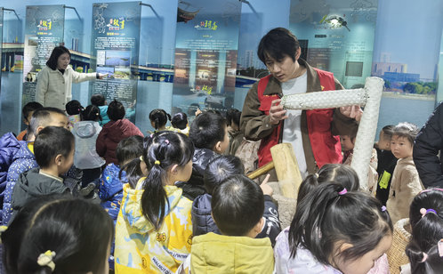 在“巾幗”志愿者的引導下,孩子們認識了蝦籠、魚叉、蓑衣、櫓槳等傳統漁具,“紅色管家”志愿者用生動語言為他們講解:“黃鱔喜歡鉆洞,鱔籠的入口有倒須,黃鱔游進去就出不來啦。”隨后,展廳后方一艘深褐色的木質漁船成為全場焦點。“這是按老漁船比例制作的模型,船尾放漁具,船舷有栓孔固定漁網。”孩子們圍聚一堂,聚精會神地聽著。通過觸摸老物件、聆聽生動的故事,孩子們在親近本土文化的同時,更建立起對漁耕文化的直觀認同。