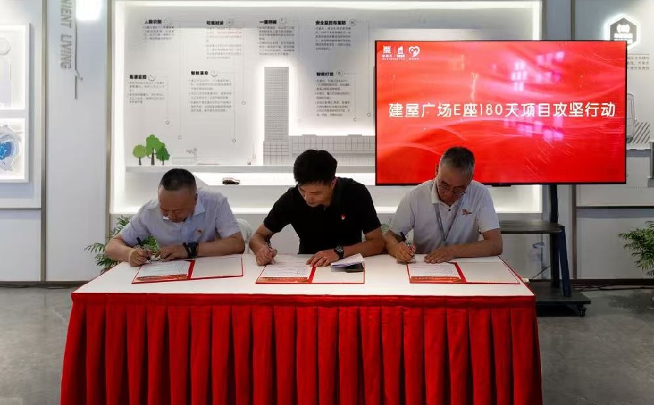 新建元建屋發展黨委將建屋廣場E座項目作為“匠心工作坊”首個試點,統籌工程建設、營銷服務、物業保障等條線20余名黨員骨干開展先鋒行動,簽署攻堅責任書,明確“進度、質量、效益”三維目標,推動黨建力量貫穿項目全鏈條。