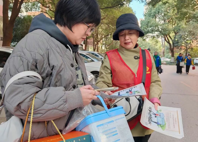 在垃圾分類宣傳現場,志愿者們身著紅馬甲,熱情地向居民發放宣傳冊,用通俗的語言細致講解“廚余垃圾如何精準投放”“廢舊電池等有害垃圾回收渠道”等常見問題?!鞍⒁?,這是我們社區的垃圾分類指引手冊,里面有詳細的分類方法和投放時間?!薄笆迨?,您家里的過期藥品可以投放到社區指定的回收點,我們一起來保護環境。”親切的交流中,環保知識悄然傳遞,社區溫暖也在鄰里間流動。在鳳凰新天地生鮮菜場,志愿者們同樣干勁十足,走到市場一個個攤位前,協助整理攤位雜物、清掃地面垃圾,并引導市場周邊非機動車規范停放,讓購物環境更加整潔有序。