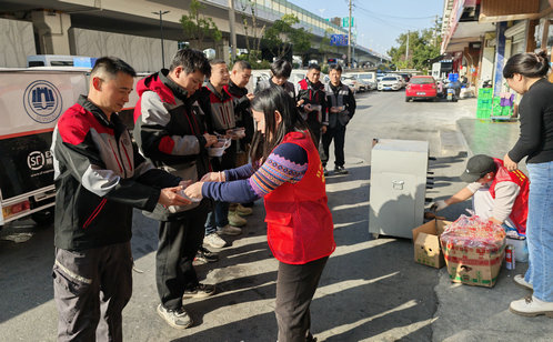 暖意手作區(qū)內,烤紅薯的香甜氣息與手工創(chuàng)作的溫馨氛圍交織相融。“紅管”志愿者將熱乎乎的紅薯遞到快遞員手中,驅散冬日的寒意;創(chuàng)意手作臺前,大家專注地用彩線、貼布裝飾保暖手套,讓溫暖在指尖傳遞、在親手創(chuàng)作中延續(xù)。