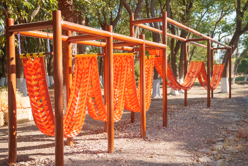 本屆藝術(shù)季以“土地與記憶的共生”為內(nèi)核,設(shè)置了多個可觸摸、可游玩、可打卡的藝術(shù)裝置。藝術(shù)家康俊彥打造的《尋跡》草席迷宮,環(huán)繞樸樹而建,路徑藏有馬家浜、崧澤、良渚三個時期的文化印記,市民游客穿梭其中仿佛“閱讀”六千年歷史,還能在特定位置等待高鐵駛過,感受古今時空的碰撞;藝術(shù)裝置《織月》由兩組秋千組成,藝術(shù)家左田東鼎將草鞋山出土文物上的古老符號,轉(zhuǎn)譯為吸睛的橙色秋千,隨風蕩起的一瞬,凝固的紋路便在織物的柔軟與起伏間,重新獲得了呼吸與溫度。