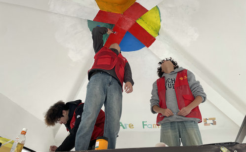 彩繪現場,師生志愿者們分工明確、默契配合。有的負責打磨亭身、修補破損處,有的勾勒線條、調配色彩,有的細致上色、完善細節。志愿者們專注的身影成為社區里一道亮麗的風景線,不少居民路過時紛紛駐足觀看。經過數日的精心創作,原本陳舊的初心亭煥然一新,藝術美感與生活氣息在此完美交融。