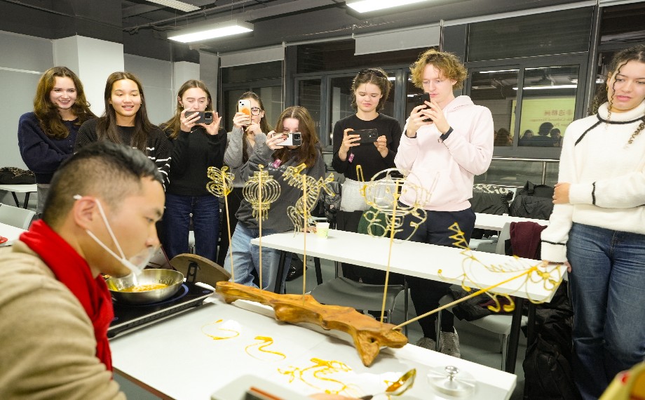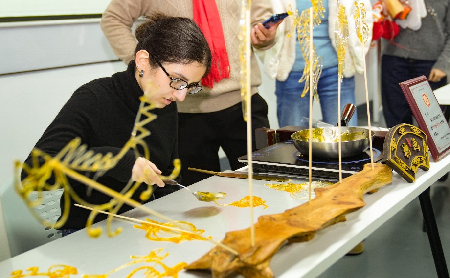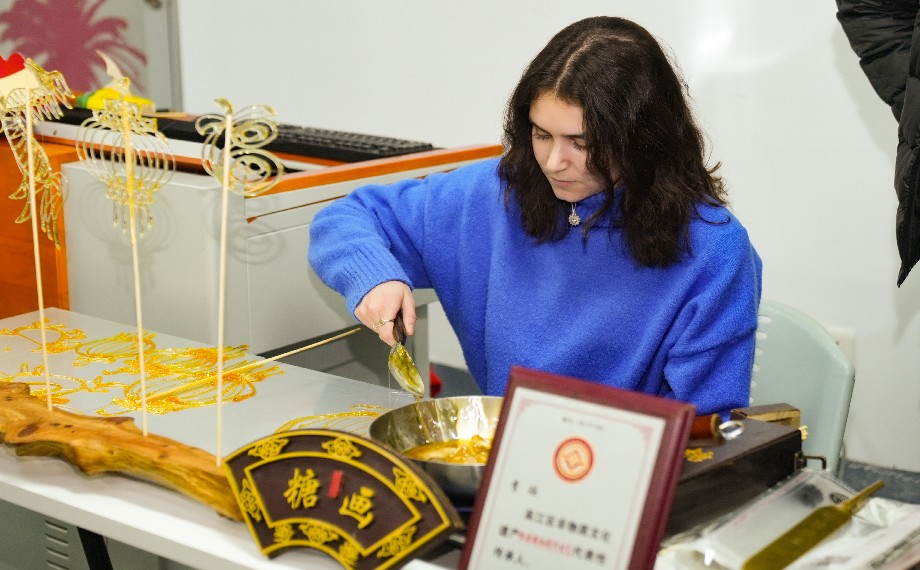 在傳承人的細(xì)心指導(dǎo)下,外籍學(xué)子們親手執(zhí)勺、以糖為墨,嘗試勾勒出駿馬、燈籠等寓意吉祥的新春元素。融化的糖漿在石板上緩緩流淌,轉(zhuǎn)瞬凝固成栩栩如生的糖畫,既是對(duì)非遺技藝的初體驗(yàn),也是對(duì)中國年味的一次生動(dòng)感知。