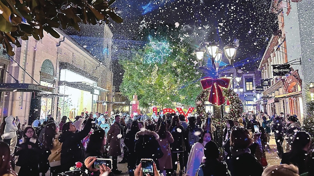 “下班帶著女兒來逛街,幾個‘骰子’、幾處布景就讓孩子們高興地互動起來了。剛剛我們還在旁邊拍了好幾張‘雪景照’。”市民章女士說。