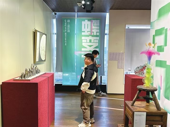 展覽分為“蝶美與共”“蝶舞共生”“蝶妙之門”“蝶變萬千”四個篇章,展現青年藝術家對江南文化的多元解讀。“本次展覽不僅是雕塑藝術的展示,更試圖構建一個‘可生長的江南意象’。”吳笠安說。現場,青年藝術家們運用金屬、玻璃鋼、樹脂等多元材料,以新穎的媒介與獨特的塑形語言,為理解江南、理解當下提供嶄新的視覺注解。