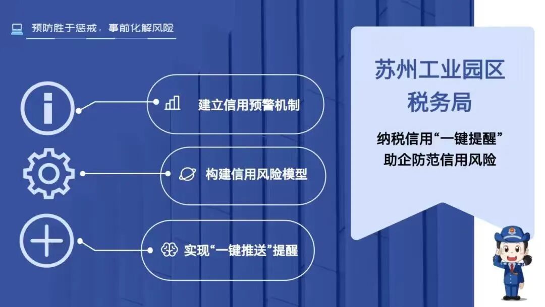 項目亮點:園區(qū)稅務(wù)局秉持“預(yù)防勝于懲戒、事前化解風(fēng)險”的工作理念,針對經(jīng)營主體生產(chǎn)經(jīng)營中易出現(xiàn)的納稅信用失分問題,創(chuàng)新推出納稅繳費信用“一鍵提醒”功能,構(gòu)建“流程預(yù)警-智能分析-精準推送”服務(wù)體系,實現(xiàn)從被動應(yīng)對向主動服務(wù)的轉(zhuǎn)變,有效防范經(jīng)營主體信用風(fēng)險。