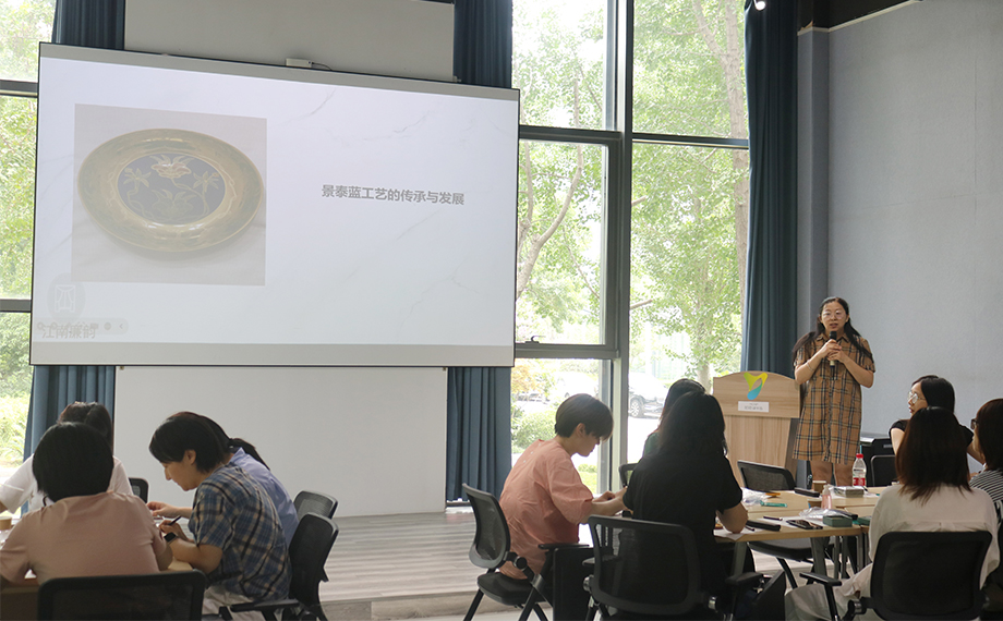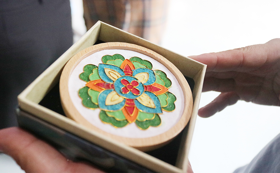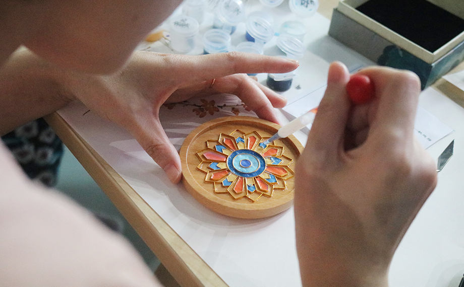 正是因?yàn)橐詼鬄榇淼牧汲純A力為民,社會(huì)才能進(jìn)步、時(shí)局才能穩(wěn)固,這也為乾隆時(shí)期景泰藍(lán)的復(fù)興創(chuàng)造了條件。景泰藍(lán),即掐絲琺瑯工藝,是中國的著名特種金屬工藝品類之一。在隨后的文化體驗(yàn)課環(huán)節(jié),大家興致勃勃地在老師的講解和幫助下參與到景泰藍(lán)手工技藝的體驗(yàn)活動(dòng)中,以金絲作胎,填充色釉,制作出屬于自己的景泰藍(lán)工藝蓮花杯墊、書簽、小鏡,用蓮心現(xiàn)廉韻,感受傳統(tǒng)文化魅力。
