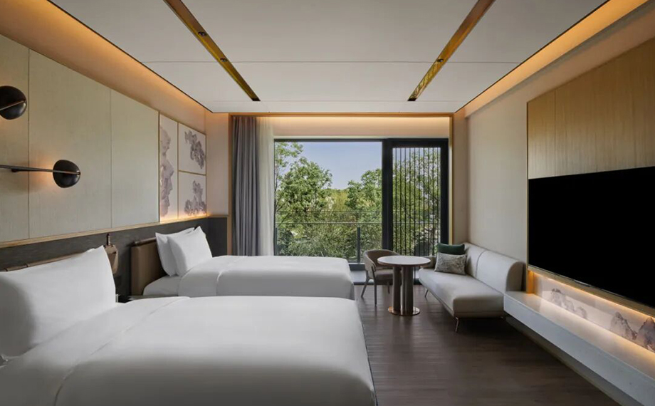 酒店擁有277間雅致客房、套房及6套獨立別墅。客房以清新淡雅的原木色調(diào),呈現(xiàn)簡約雅致的現(xiàn)代美學風格,其間點綴的太湖石裝飾畫、中式屏風等將蘇州園林意境巧妙融入,凸顯東方逸趣。客房自帶陽臺,配備65寸高清電視支持無線投屏功能,并配有輕智能馬桶、無線充電藍牙音響等智能化設(shè)備及高速無線網(wǎng)絡(luò)。房內(nèi)布置提取了太湖石、大閘蟹等蘇式元素進行設(shè)計,并臻選舒適床品與精致洗浴用品,讓旅途中的休憩倍添愜意。