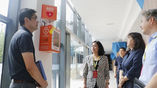 調(diào)研組一行首先前往玲瓏灣社區(qū),實地考察社區(qū)內(nèi)AED的安裝位置、設(shè)備維護及公眾可及性等情況。隨后,走進西安交通大學(xué)蘇州附屬初級中學(xué),深入了解了校園內(nèi)AED的配置數(shù)量、標識指引以及師生培訓(xùn)情況。